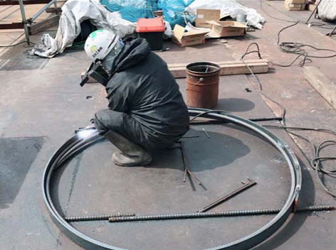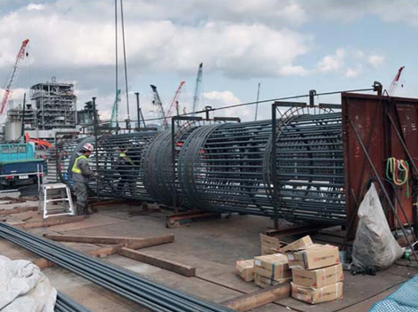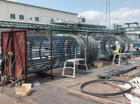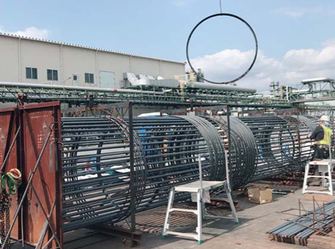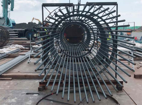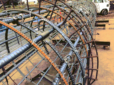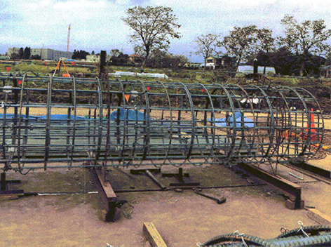 本物品は橋脚、建物等の鉄筋コンクリート構造物のコンクリート柱に必要な円筒状鉄筋籠を組み立てる際に使用する主鉄筋保持台である。コンクリート柱には補強のため「鉄筋籠参考図4」に示すような円筒形状の鉄筋籠が埋設される。この鉄筋籠は「異形鉄筋参考図5」に示すような丸鉄棒の表面に凹凸を設けた異形鉄筋で製作される。大型構造物用の鉄筋籠は円筒径が1〜3メートルにもなり現場での組み立ては困難であるため工場で組み立てて現場に持ち込まれる。本物品はこの工場での組み立ての際に複数の主筋を「使用状態を示す参考図2」に示すように円筒状に保持しておくためのものである。このように円筒状に保持した状態でその周りに帯筋を溶接で取り付ける。「使用状態を示す参考図3」は参考図2を右側から見た図で主筋の掛け方を示している。作業終了後には「分離正面図」に示すように左右に分離して鉄筋籠から取り外す。主筋保持部は異形鉄筋を溶接して製作されており、主筋保持部は基台板に溶接取り付けされている。